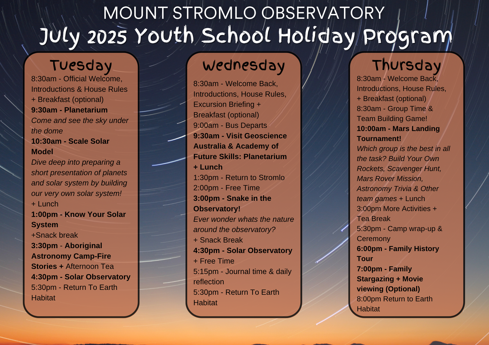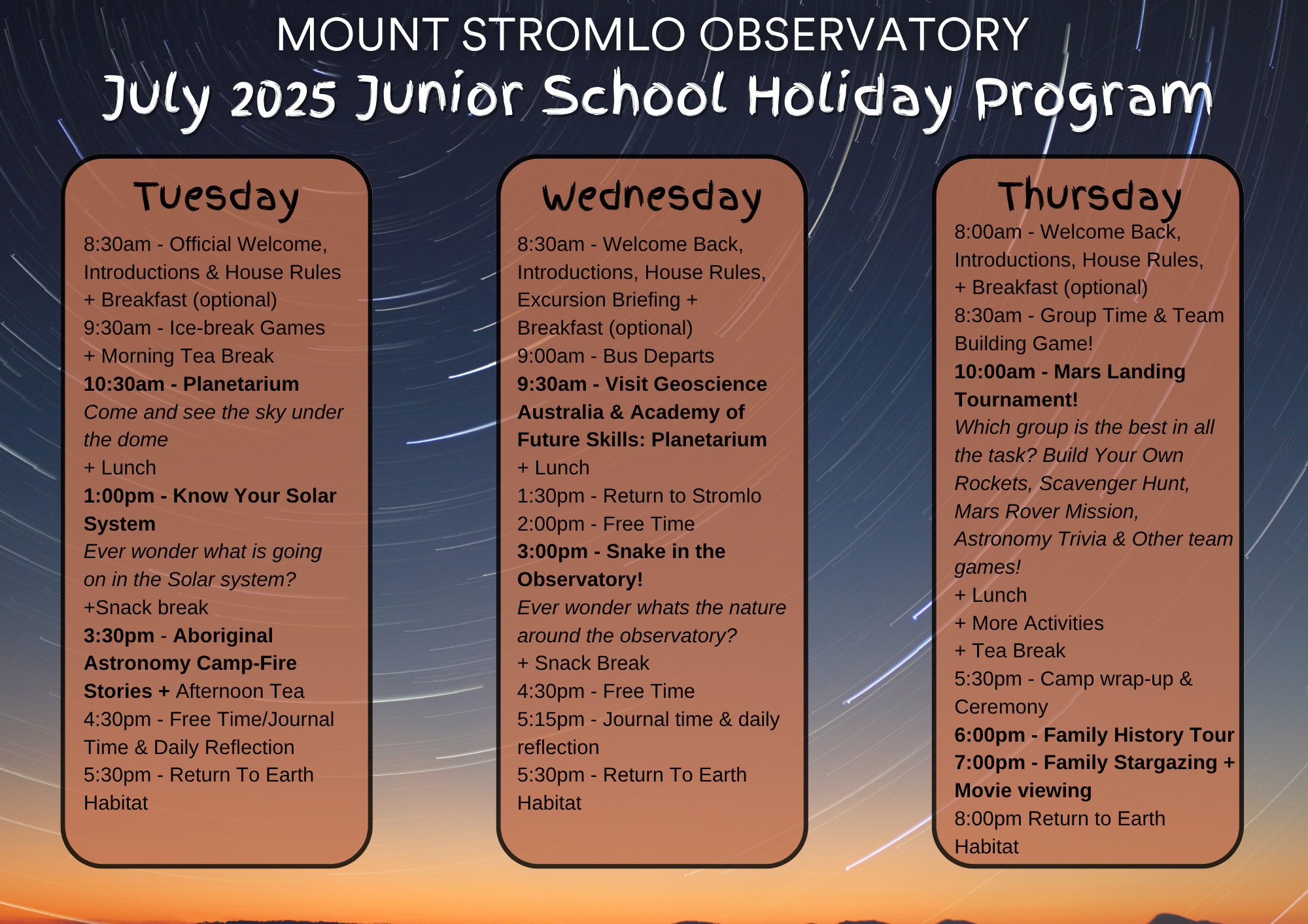 Each day is packed with hands-on science, energetic team missions, and plenty of outdoor fun in the stunning surrounds of Mount Stromlo.